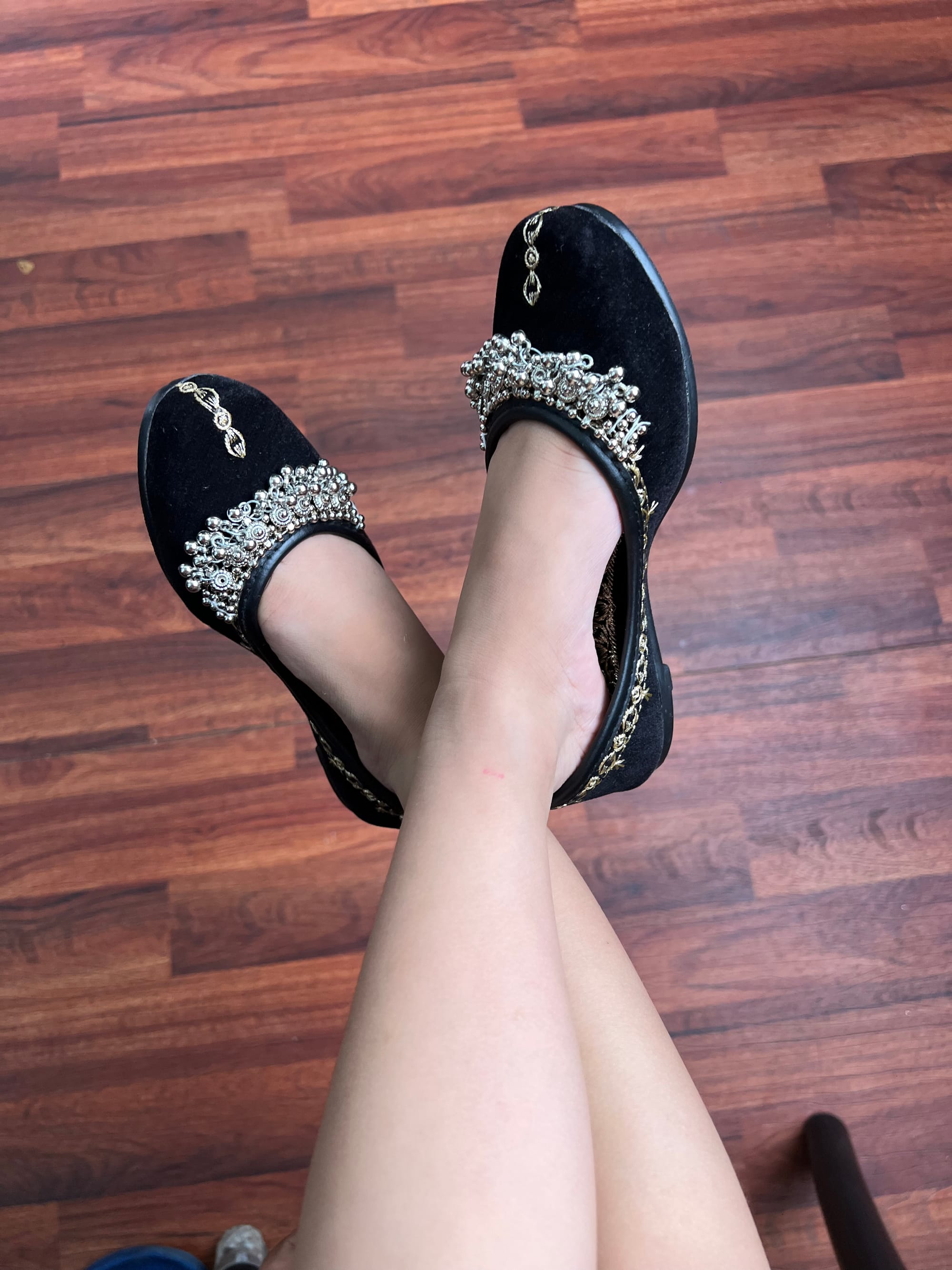 Adorable and elegant, our Black Velvet Beaded Khussa Sandal is specially handcrafted for kids in the traditional Pakistani–Indian Mojari style. Made with soft velvet and delicate beadwork, it offers comfort, flexibility, and festive charm for little feet.